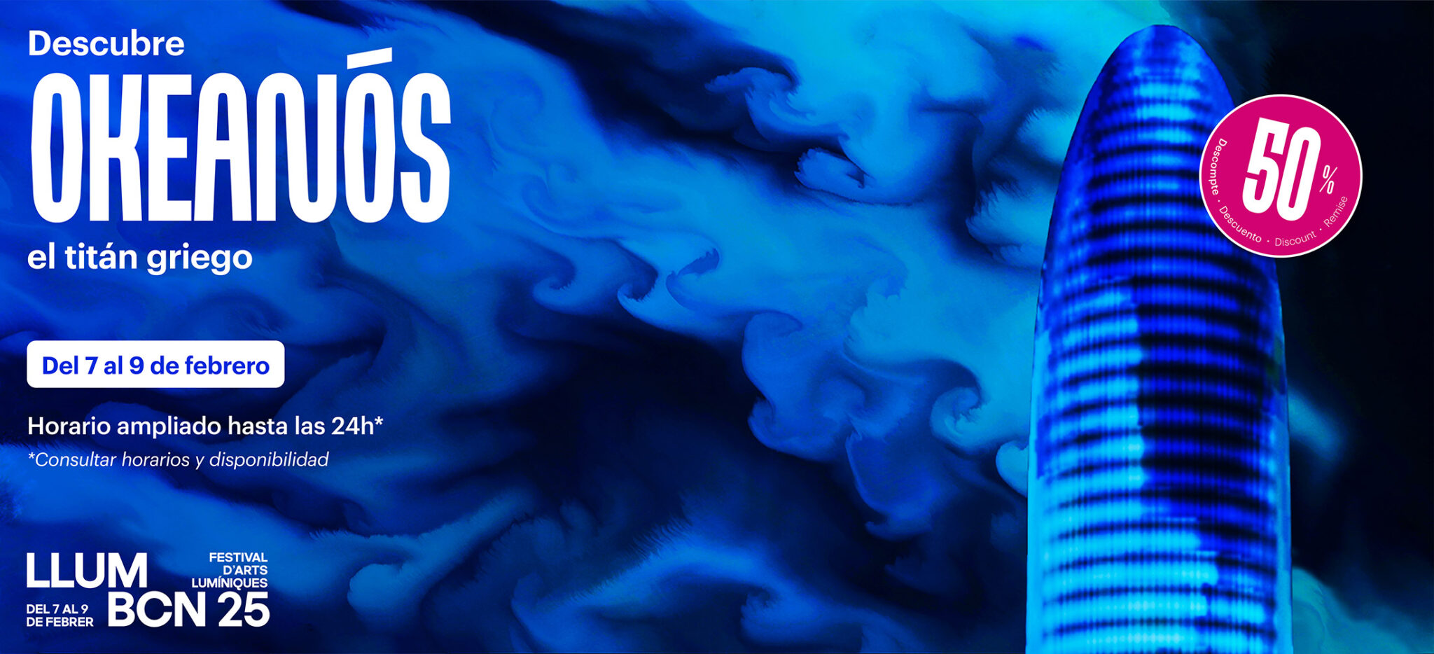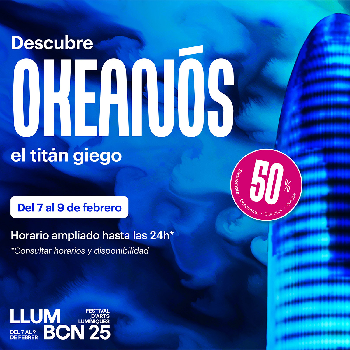 La Torre Glòries se transforma en OKEANÓS, el titán griego, hijo de Urano (el Cielo) y Gea (la Tierra) que personifica el océano que envuelve a la Tierra como una entidad global única y viva. Como un géiser viviente de luz y color, la torre se erige como portal del océano en la ciudad, revelando a través de un baile hipnótico de azules y verdes, los patrones ocultos de la vida marina, gracias a la visualización de datos científicos obtenidos por satélites de la NASA y la ESA.